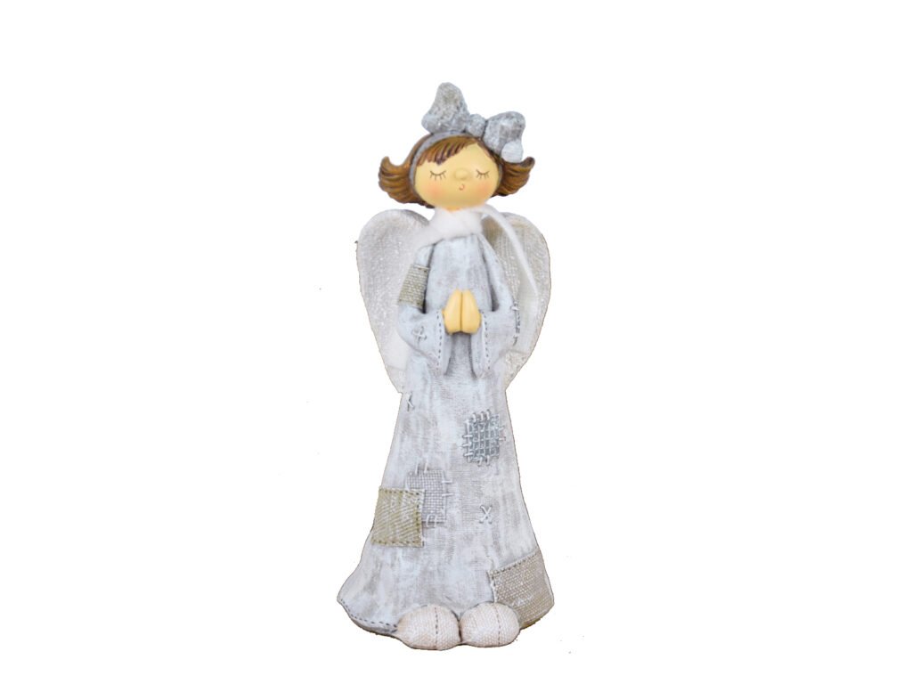 Anjel s látanými šatami, s mašľou, 23cm, biela/sivá|Ego dekor