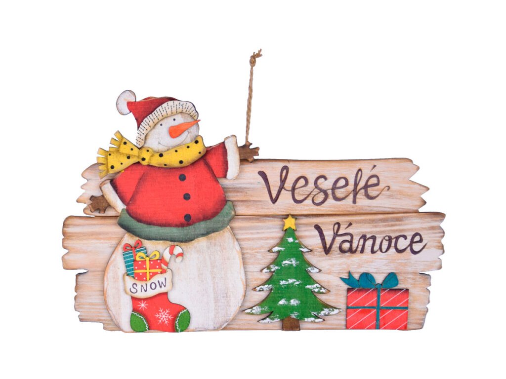 Ceduľa snehuliak XMAS, závesná, drevo, béžová/červená, 35x22x2cm, ks|Ego dekor