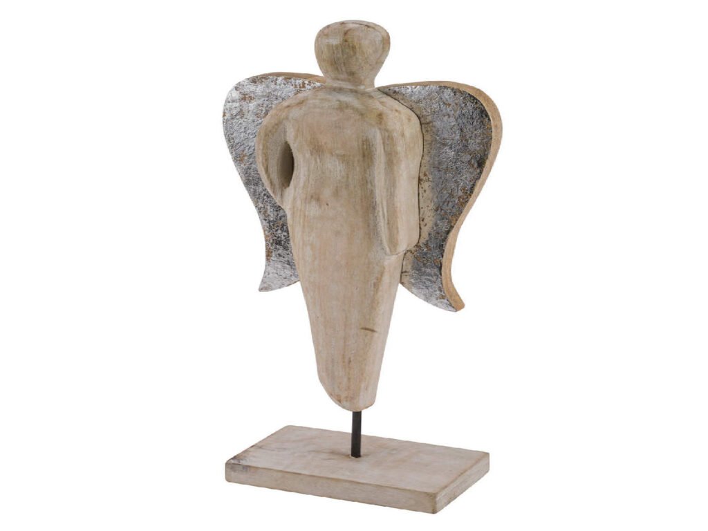 Dekorácia anjel na podstavci, mang. drevo, strieborná/biela, 18x6x45cm, ks