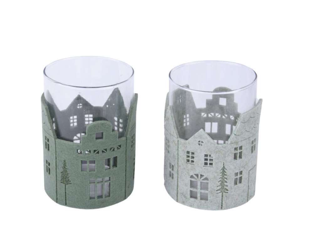 Svietnik s domčekmi, plsť/sklo, tm. zelená/zv. zelená, 9,5x13x9,5cm|Ego dekor